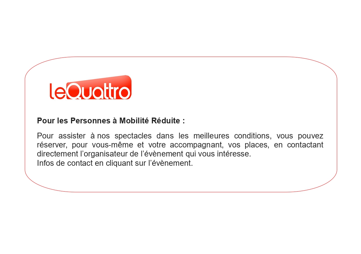 - Au guichet du Quattro le Mercredi de 9h à 12h30 et de 14h à 17h30, et 1h avant le début de chaque spectacle, ou sur lequattro.fr